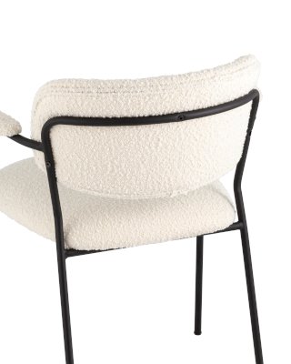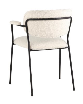 Современный обеденный стул с подлокотниками и металлическими ножками. Обивка выполнена из мягкой и легкой ткани букле. Красивый и очень мягкий материал, который оставляет ощущение теплоты и уюта. Металлический каркас черного цвета огибает спинку и плавно переходит из подлокотников в ножки. Широкое сиденье обеспечивает удобную посадку и уют. На подлокотниках для дополнительного комфорта предусмотрены мягкие накладки.
