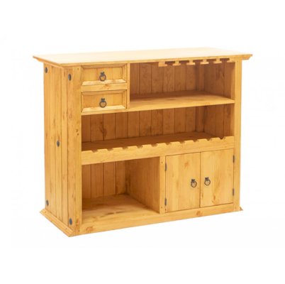 Оригинальное и просто незаменимое приобретение для загородного дома или квартиры! Настоящий деревянный бар разместит бутылки, сверху можно повесить бокалы. Два малых ящика и небольшой шкаф с дверцами пригодятся для хранения мелочей, салфеток, прочих аксессуаров.  Модель отлично сочетается с классической мебелью и гармонирует с интерьерами в стиле прованс.