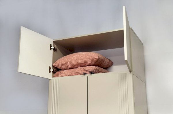 Особое внимание заслуживает фрезеровка фасадов, которая придаёт антресоли изысканный вид. Толкатели PUSH вместо ручек обеспечивают удобное открывание нажатием.