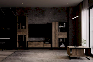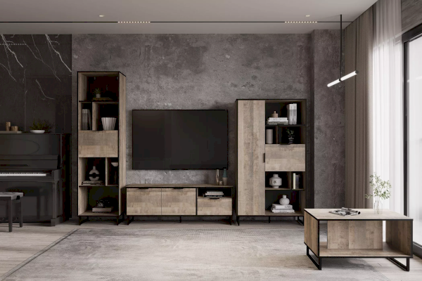 Стеллаж из коллекции ФОЛК легко впишется в интерьер гостиной в стиле Лофт, придав ей современный и монументальный вид. Черная лаконичная ручка и металлические опоры подчеркивают оригинальный дизайн мебели, а черная кромка эффектно выделяет фасад изделия.