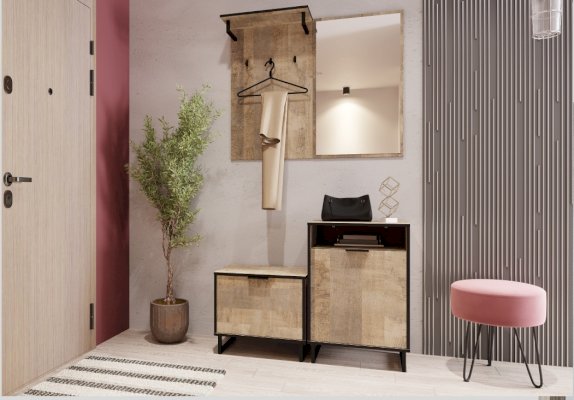 Вешалка представлена в двух цветах – Дуб Гранж Песочный и Дуб Самдал. Вешалка оснащена тремя крючками квадратной формы и навесной полкой для удобного размещения верхней одежды и головных уборов.