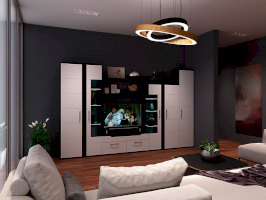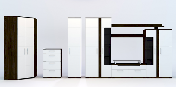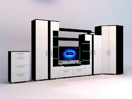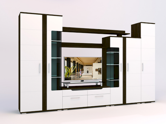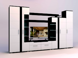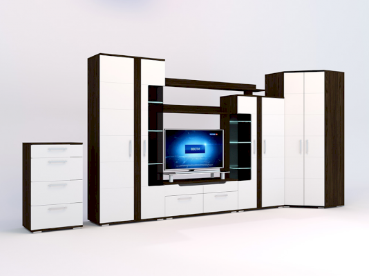 Стенка «Барселона» выполнена в стильном современном дизайне, прекрасно сочетающем в себе контрастность цвета, ассиметричное исполнение, стеклянные витринные модули и элементы подсветки. Фасады МДФ