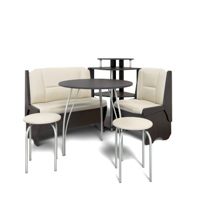 Оригинальный кухонный уголок Лотос отличается от других похожих кухонных гарнитуров. Он состоит из двух отдельных диванчиков и этажерки, заменяющей угловую мягкую часть. Круглый кухонный стол в отличие от других наборов мебели на металлическом основании как и два круглых табурета. Набор мебели для кухни включающий в себя большую прямую скамью,малую прямую скамью,угловую этажерку, стол на металлических ногах и два табурета на металлокаркасе. В прямых скамьях под сиденьями расположены ящики.