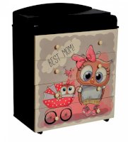 Пеленальный комод 800/4 Lilu 6 отличается привлекательным дизайном с использованием тематических детских принтов. В конструкции изделия предусмотрены 4 маленьких передвижных колеса, несколько вместительных ящичков на шариковых направляющих и откидывающаяся пеленальная столешница. Детский пеленальный комод, декорированный красочным рисунком, вмещает в себя постельные принадлежности, средства гигиены, распашонки, подгузники, игрушки, ползунки и другие личные вещи ребенка. Гладкая столешница идеально подходит для пеленания ребенка, а колесики позволяют быстро перемещать комод.